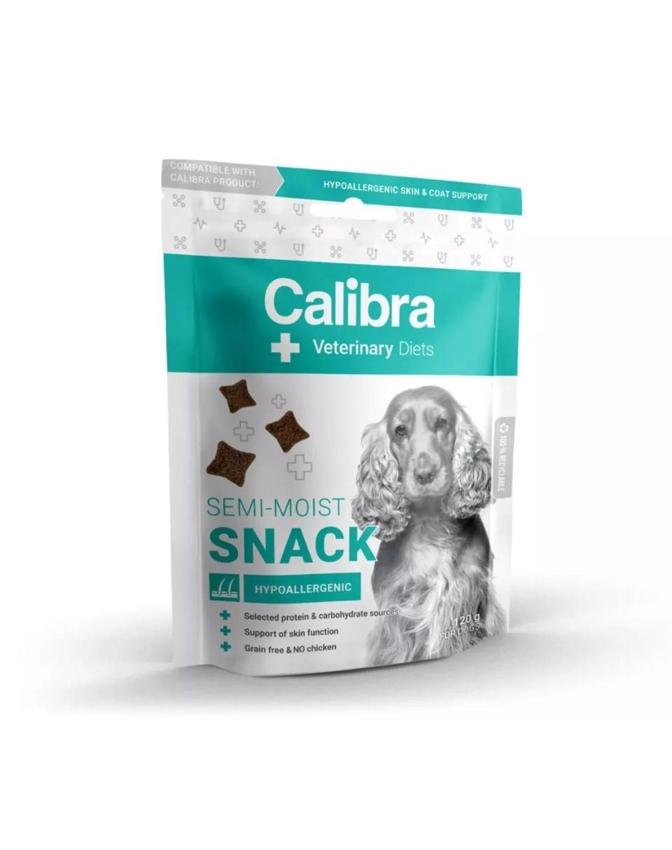 Recompensează-ți câinele cu recompensele hipoalergenice Calibra, care sunt compuse din carne proaspătă și nu conțin cereale sau pui.