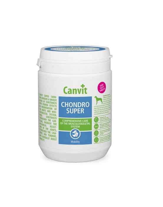Canvit chondro super este un amestec unic de substanțe cu efecte regenerative dovedite asupra articulațiilor și a sistemului musculo-scheletic. Aceste substanțe întăresc cartilajul articular, cresc rezistența articulațiilor, a tendoanelor și a ligamentelor. Supliment alimentar pentru câini care conține sulfat de glucozamină, sulfat de condroitină, MSM (metilsulfonilmetan), acid hialuronic, acid ascorbic.