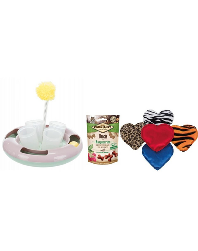 Un set sub forma unui cadou ideal pentru orice pisică: cu o jucărie interactivă, inimă de pluș cu valeriană și delicatesele Carnilove.