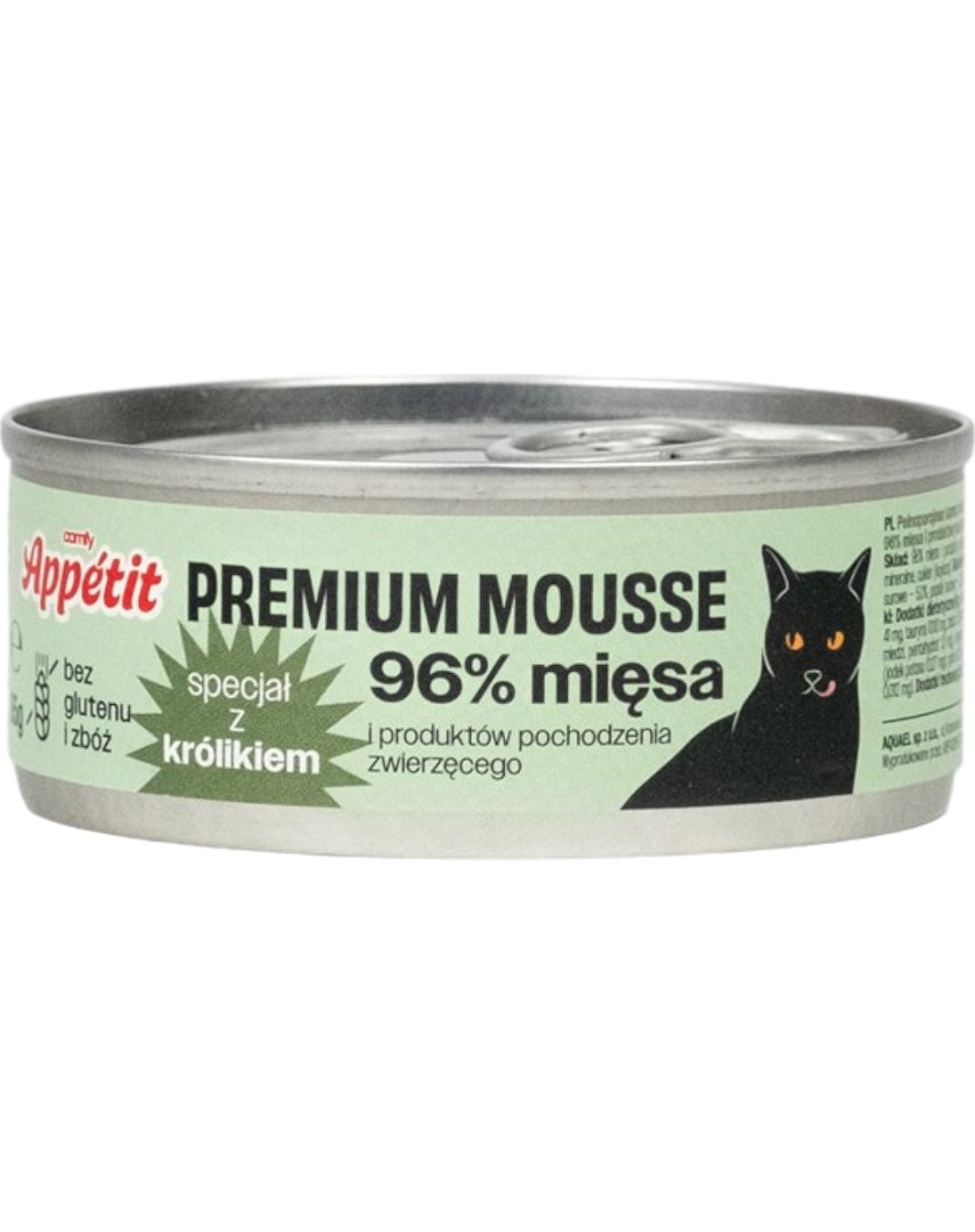 Comfy Appetit premium Mousse conține 96% carne și ingrediente de origine animală (inclusiv 27% iepure), iar restul constă în vitamine și minerale.