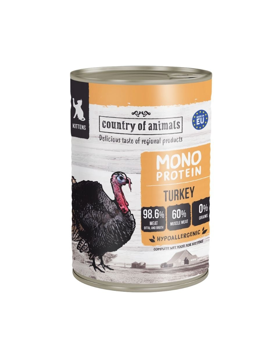 Hrana umedă monoproteică Country of Animals este mai mult decât o simplă masă zilnică pentru animalul tău. Este o combinație de gust excelent și o formulă atent echilibrată, creată pentru sănătatea și digestia sensibilă a pisoiului.