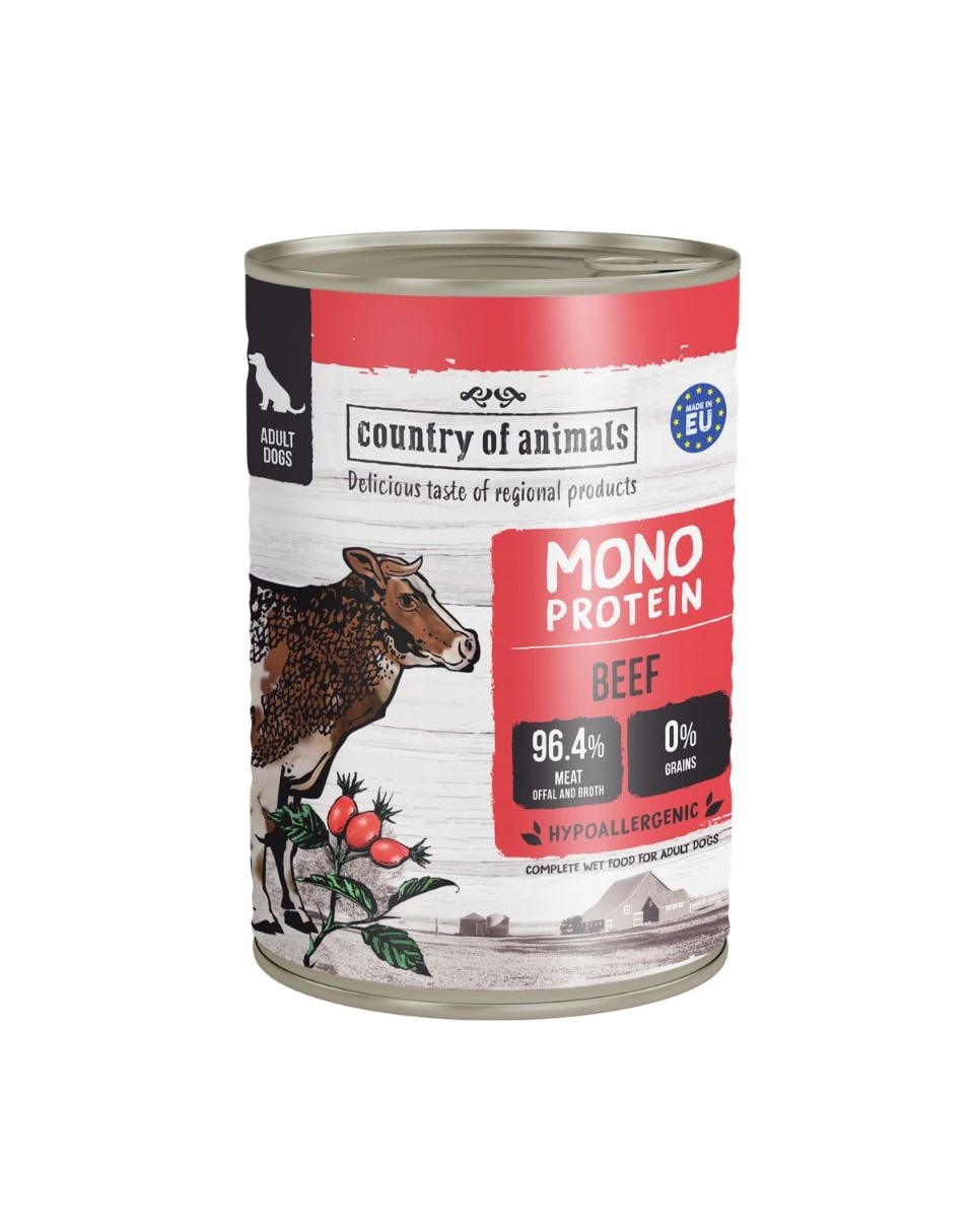 Hrană umedă monoproteică Country of Animals este mai mult decât o masă zilnică obișnuită pentru animalul tău. Este o adevărată sărbătoare, în care gustul excepțional se îmbină cu o compoziție unică și sănătoasă, care sprijină sănătatea și sistemul digestiv delicat al câinelui.