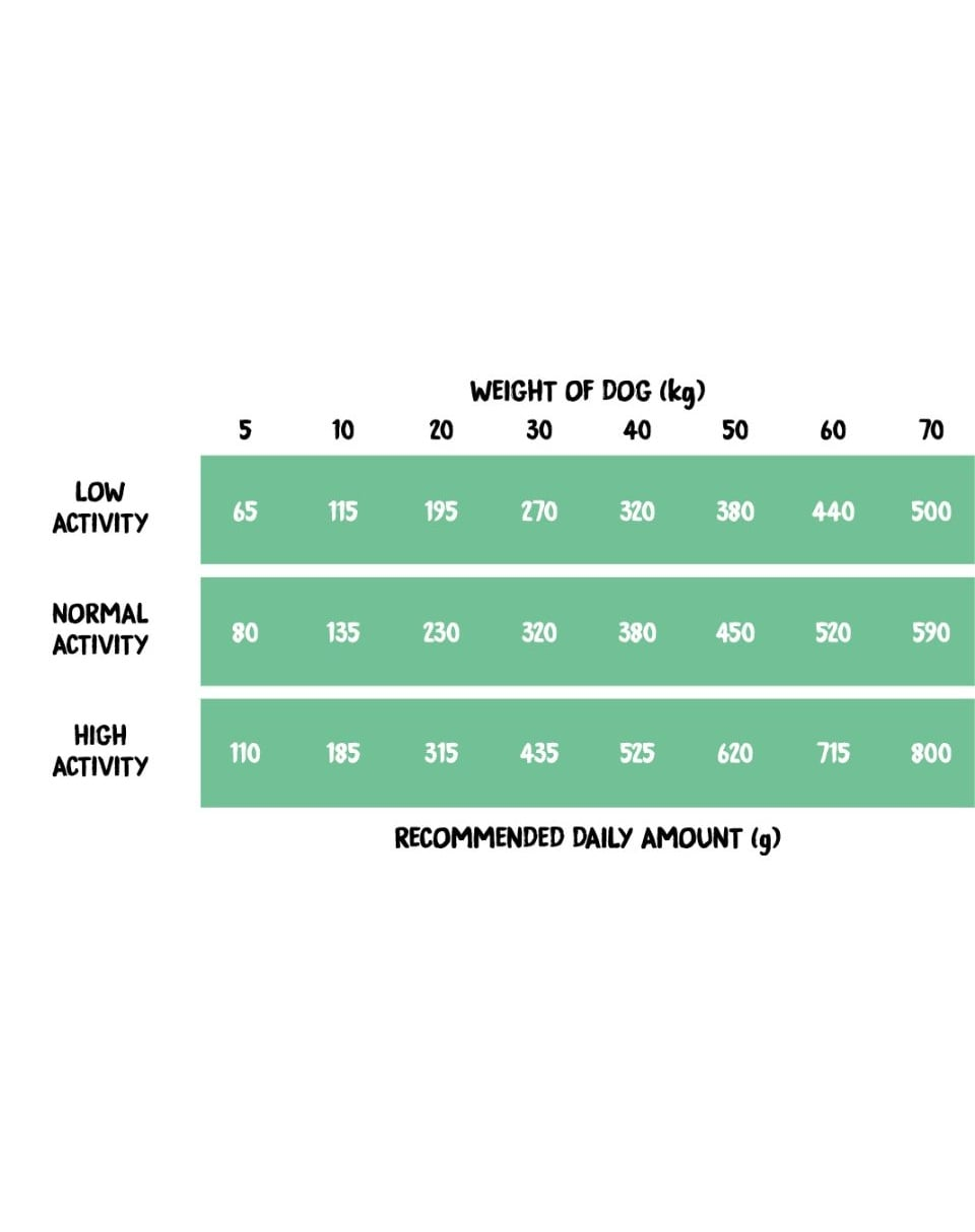 Ingrediente: curcan (39% – în care 22% curcan uscat, 17% curcan proaspăt), iepure uscat (16%), mazăre, mazăre decojită, grăsime de porc (9,5%), fulgi de cartofi uscați, ficat de pui hidrolizat (4%), semințe de in, pulpă de sfeclă uscată (fără zahăr), ulei de somon (1,5%), lignoceluloză (din molid), minerale, drojdie uscată de bere (0,5%), cicoare uscată, MOS (manooligozaharide), merișor uscat, glucozamină, sulfat de condroitină, extracte vegetale (rozmarin, citrice, turmeric, eugenia, yucca Mojave).