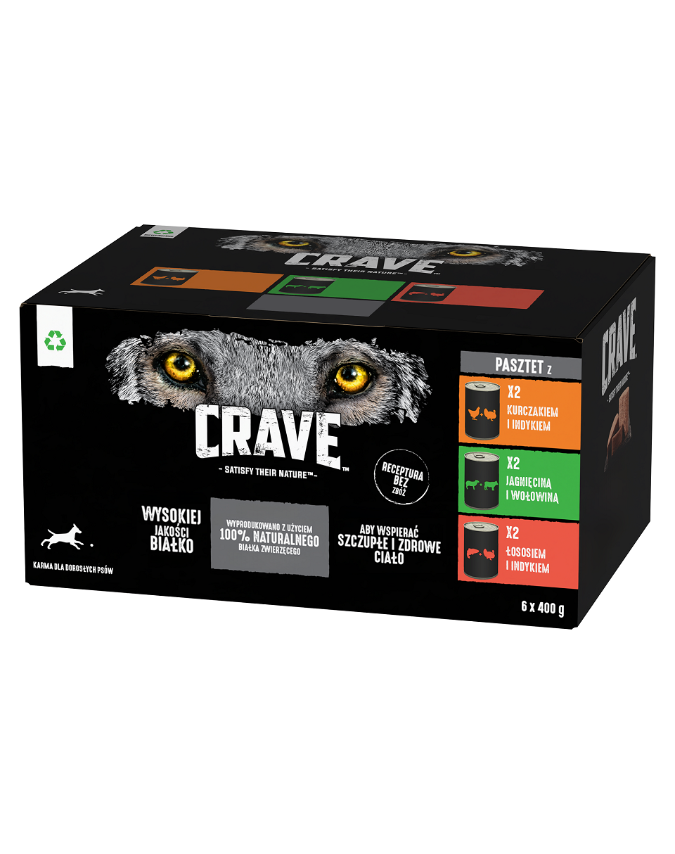CRAVE cu pui și curcan, cu miel și vită și cu somon și curcan este o hrană completă și echilibrată pentru câinele adult. Pateurile CRAVE sunt bogate în carne și produse animale. Acestea favorizează dezvoltarea musculaturii și o viață sănătoasă pentru animalul dumneavoastră de companie. Este o hrană bogată în proteine, fără adaos de cereale și toate ingredientele, folosite în producția sa, sunt de înaltă calitate. Acest lucru creează o masă echilibrată pentru orice câine, indiferent de mărime sau rasă.