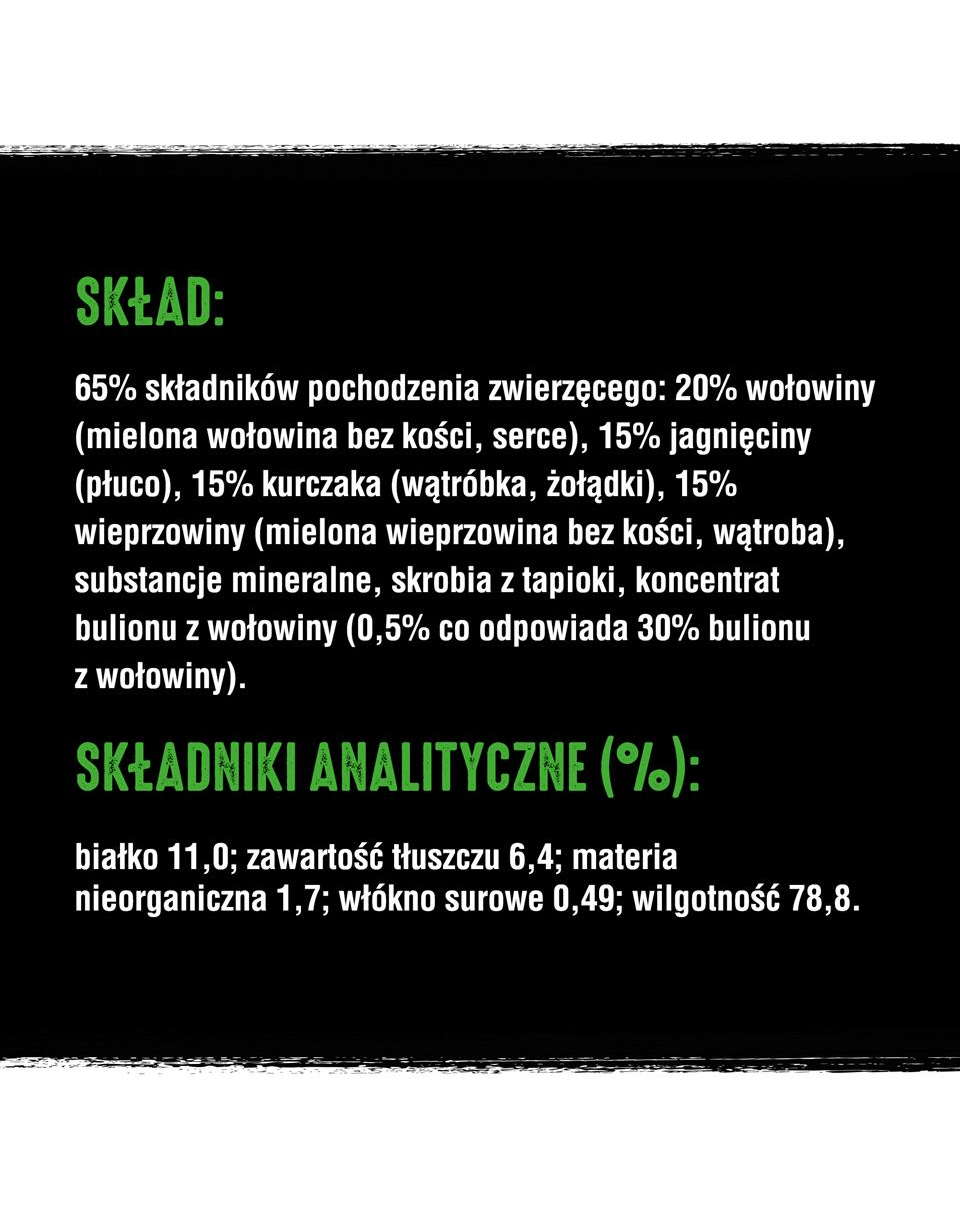 65% ingrediente animale: 20% carne de vită (carne de vită fără os măcinată, inimă), 15% miel (plămâni), 15% carne de pui (ficat, stomac), 15% carne de porc (carne de porc fără os măcinată, ficat), minerale, amidon din tapioca, carne de vită concentrat de stoc (0,5% corespunzând 30% stoc de carne de vită).