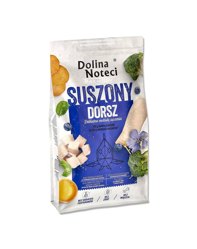 Hrană completă uscată pentru câini adulți de toate rasele, din cod. Hrana uscată Dolina Noteci Premium este o linie unică de produse pentru hrana câinilor adulți, produsă cu ajutorul unei tehnologii inovatoare de uscare la temperaturi scăzute. Acest proces asigură faptul că materiile prime proaspete utilizate în producție își păstrează valoarea nutritivă ridicată, minimizând pierderea de vitamine și minerale valoroase. Hrana uscată combină o serie de avantaje: nutrienți bogați și unici, procesare redusă, comoditate în consum și palatabilitate ridicată.
