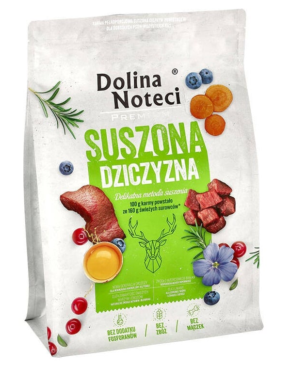 Dolina Noteci Premium cu vânat este o hrană completă, uscată, destinată câinilor adulți de toate rasele, oferindu-le energia și nutrienții necesari pentru menținerea sănătății și bunei condiții fizice. Formula se bazează pe ingrediente de înaltă calitate provenite din carne și organe de vânat, vită, porc și cod, care reprezintă 80% din compoziție, dintre care 40% sunt mușchi scheletici – o sursă esențială de proteine și creatină.