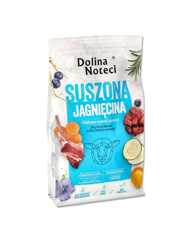 80% din compoziția hranei uscate este formată din carne și organe de miel, vită, porc și cod, cu o proporție excepțional de mare de mușchi scheletici, de până la 40%. Mielul, ca materie primă cu calități senzoriale deosebite, asigură palatabilitatea ridicată a hranei uscate. Distribuția corectă a acizilor grași polinesaturați este, de asemenea, menținută prin adăugarea de ulei de semințe de in, care este bogat în acid linolenic. Dolina Noteci Premium Lamb nu conține cereale, care provoacă adesea alergii, ci a fost înlocuită cu un alt carbohidrat, amidonul de cartofi.