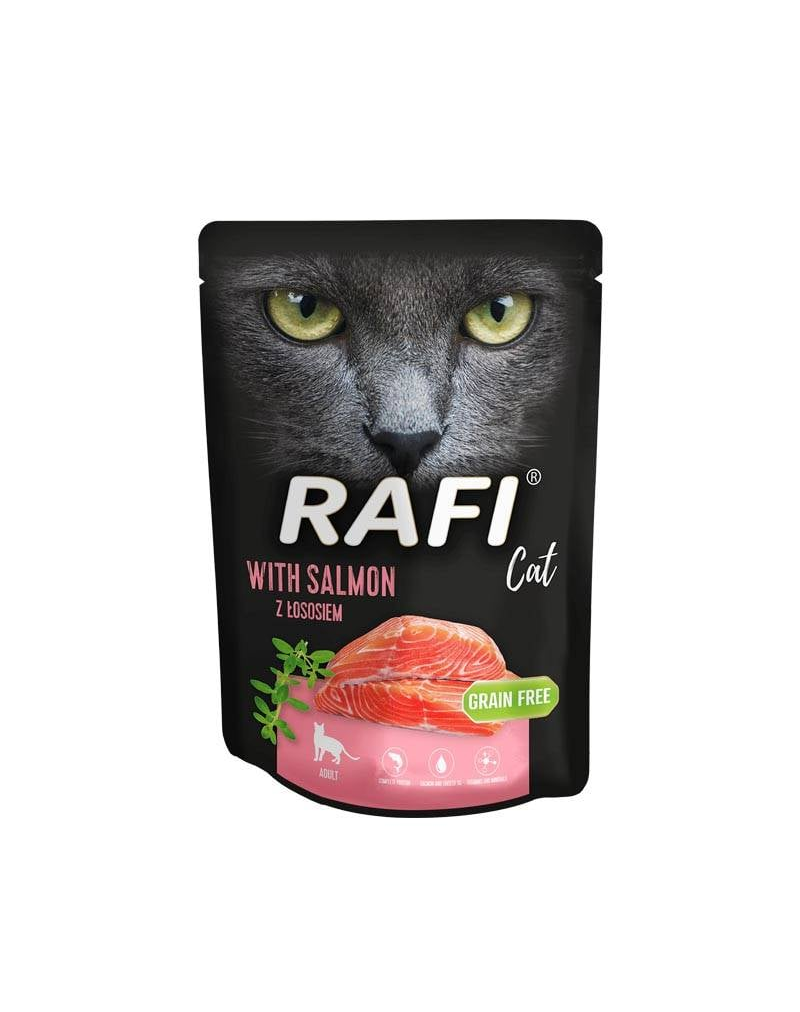 Hrana umedă completă Rafi Cat's cu somon este o hrană care susține menținerea unei greutăți corporale optime și bunăstarea animalului dumneavoastră de companie. Datorită conținutului ridicat de carne și produse de origine animală, inclusiv somon, alimentul oferă proteine de înaltă calitate, ușor de digerat, precum și aminoacizi precum leucina, lizina și seleniu.