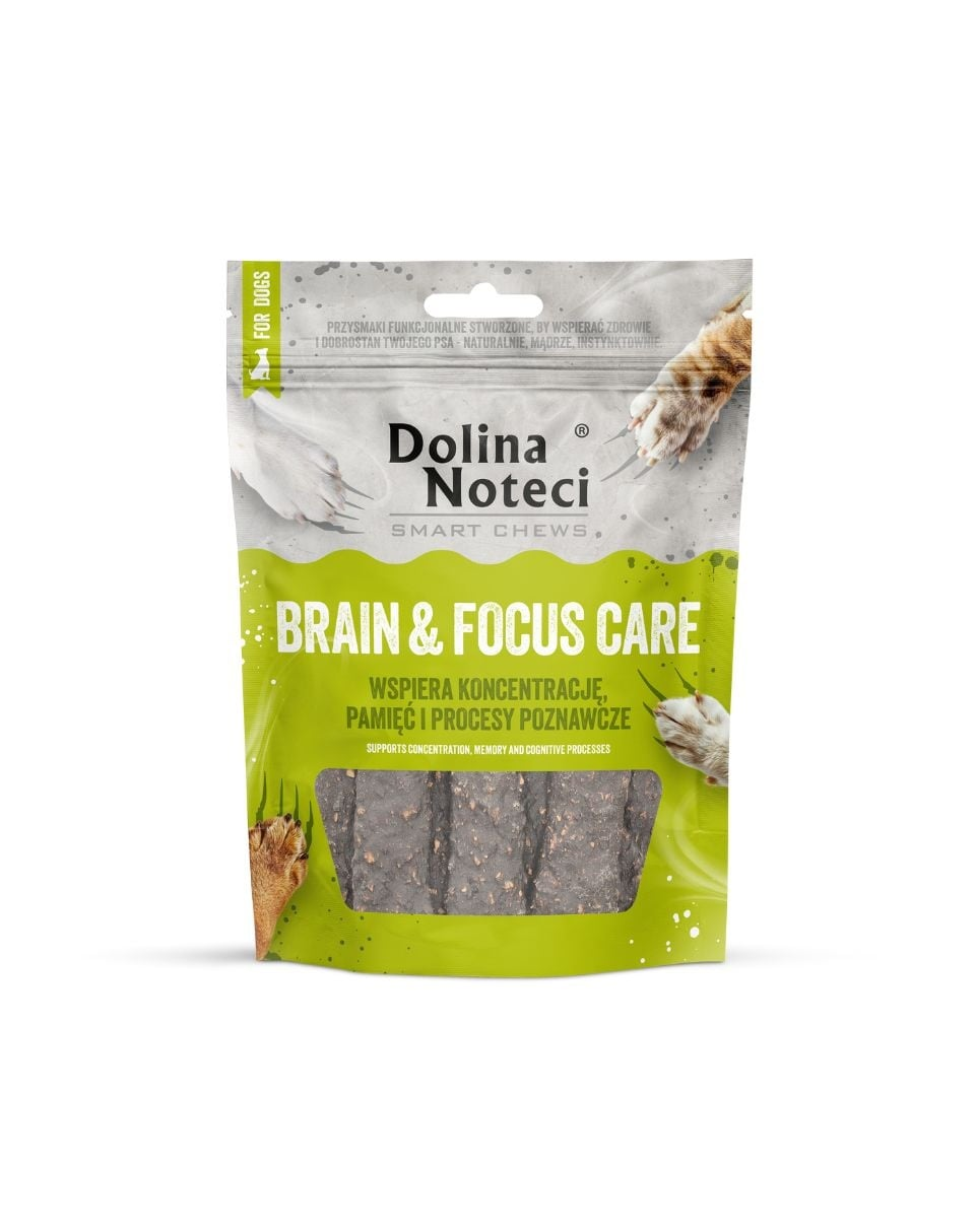 Dolina Noteci Smart Chews Brain & Focus Care sunt recompense uscate create pentru câini adulți și seniori de toate rasele care au nevoie de sprijin pentru menținerea performanței mentale. Formula bazată pe 80% carne și produse de origine animală oferă gust intens, valoare nutritivă ridicată și un aport optim de proteine și grăsimi ușor asimilabile. Completează dieta zilnică cu aminoacizi esențiali și acizi grași valoroși.