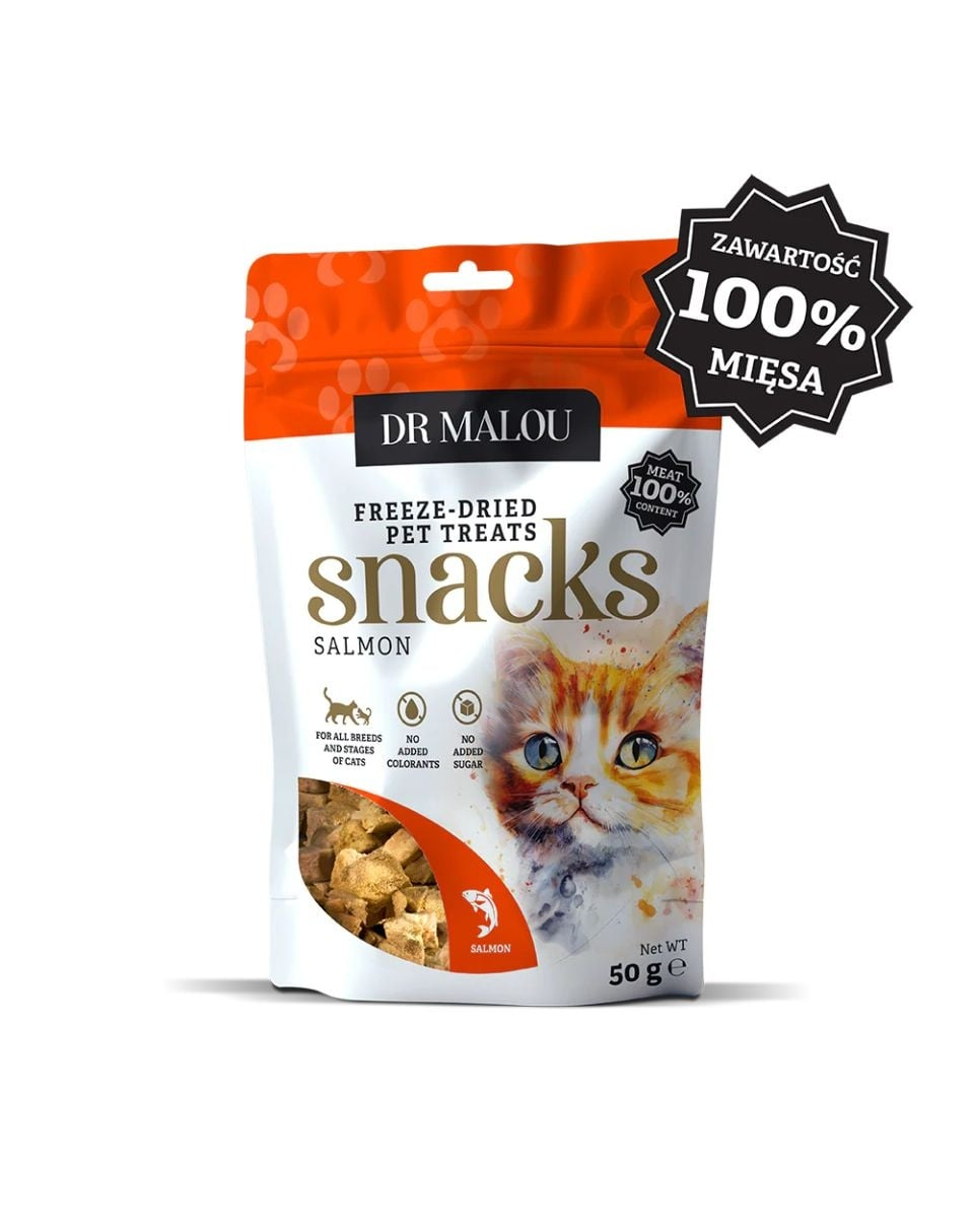 Oferă-i pisicii tale o adevărată delicatesă – cuburi naturale liofilizate din 100% carne de somon de la Dr Malou! Este o hrană complementară cu compoziție pură, gust intens și bogată în nutrienți.