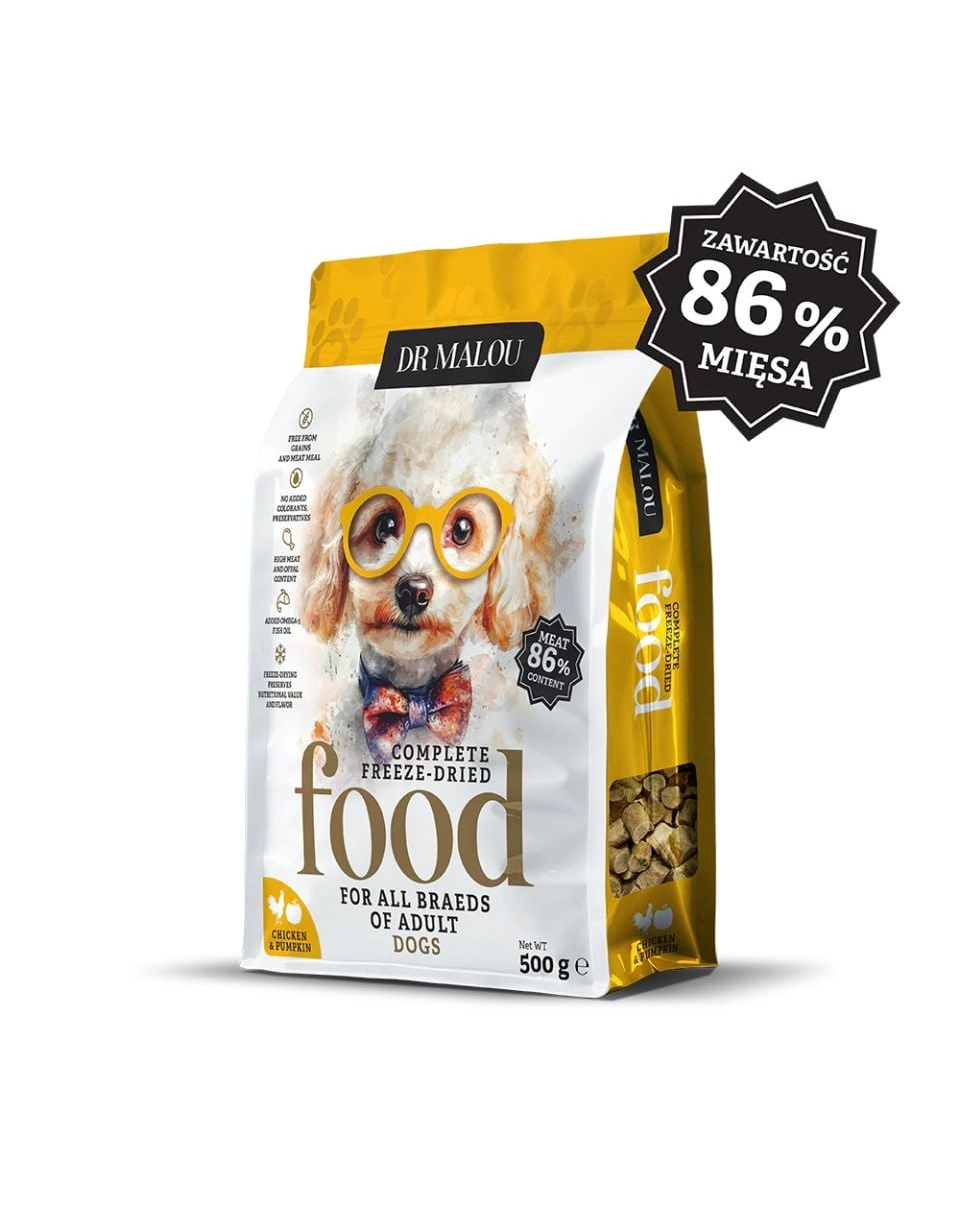 Hrana oferită de Dr Malou este un aliment natural excelent, creat pentru sănătatea câinilor adulți de toate rasele. Rețeta se bazează pe 70% carne de pui, îmbogățită cu organe (inimi și ficat), dovleac și semințe de in. Această compoziție asigură o digestibilitate ridicată a proteinelor, o masă musculară sănătoasă, o imunitate puternică și un sistem digestiv echilibrat în fiecare zi.