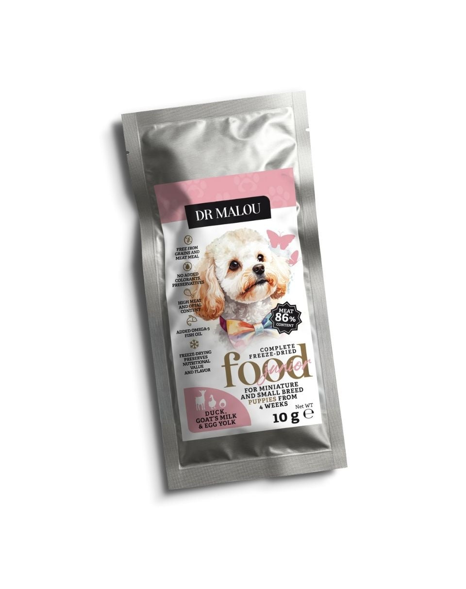 DR MALOU Puppies Hrană liofilizată rață cu lapte de capră și gălbenuș 10 g hrană uscată pentru căței