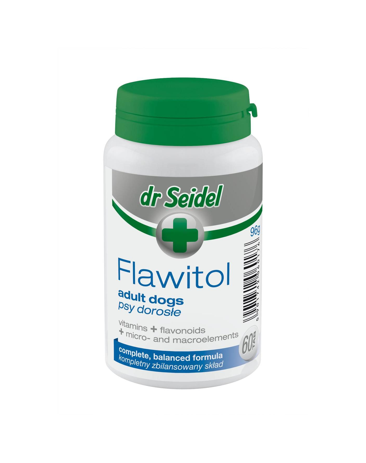 Supliment multivitaminic pentru câini adulți. DR SEIDEL Flawitol este un supliment nutritiv destinat câinilor adulți, conceput pentru a asigura aportul zilnic de vitamine, minerale și oligoelemente necesare menținerii unei stări generale bune.