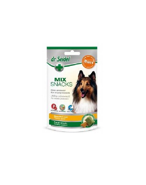 DR SEIDEL Mix 2W1 sunt gustări concepute pentru câini adulți, care susțin simultan sănătatea pielii și a blănii, precum și menținerea unei respirații proaspete.