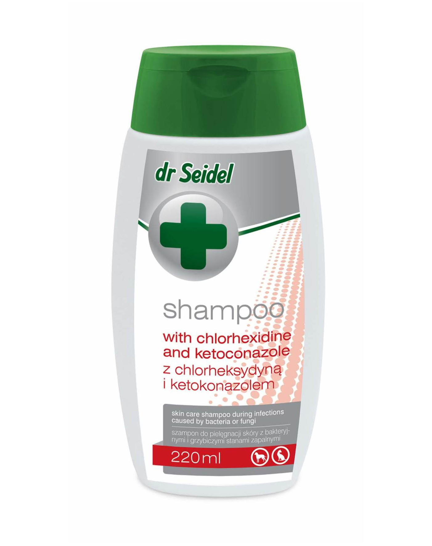 Șampon dermatologic pentru infecții bacteriene și fungice. DR SEIDEL este un șampon specializat pentru câini și pisici, formulat pentru îngrijirea pielii afectate de infecții bacteriene și fungice, utilizat ca suport în terapia dermatologică.