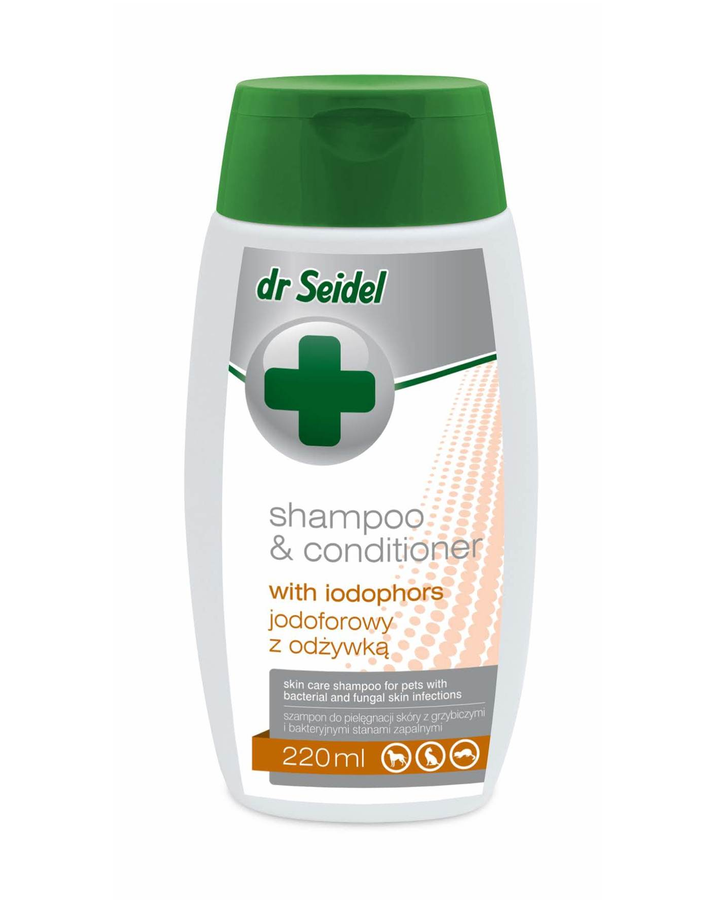 Șampon dermatologic pentru infecții bacteriene și fungice ale pielii. DR SEIDEL este un șampon cu jodofori, destinat îngrijirii pielii câinilor în caz de infecții bacteriene și fungice, precum și în afecțiuni cutanate asociate cu mâncărime și inflamație.