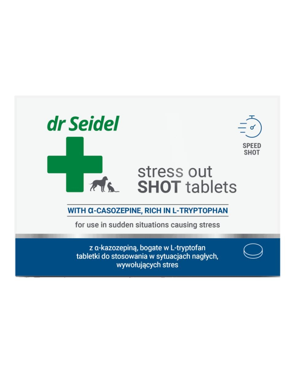 Tablete calmante pentru situații stresante acute. DR SEIDEL Stress Out SHOT sunt tablete destinate câinilor și pisicilor, formulate pentru reducerea rapidă a stresului în situații punctuale precum vizite la veterinar, călătorii sau zgomote puternice.