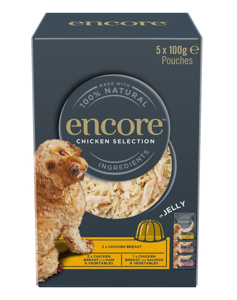 ENCORE Dog Chicken Selection in Jelly Multipak 5×100 g este un supliment natural pentru câini adulți, prezentat sub formă de plicuri gustoase cu piept de pui în jeleu ușoară. Fiecare variantă se bazează pe un ingredient simplu și natural, fără coloranți artificiali, conservanți sau umpluturi inutile, fiind ideal pentru a diversifica dieta zilnică a câinelui.
