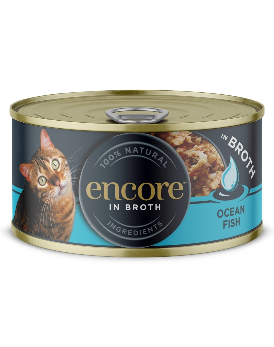Encore Cat Adult Ocean Fish in Broth pește oceanic în bulion este o hrană umedă complementară, fără cereale, pentru pisici adulte, realizată din ingrediente naturale. Formula se bazează pe o combinație de macrou (45%) și file de ton (30%), scufundate într-un bulion ușor de pește.