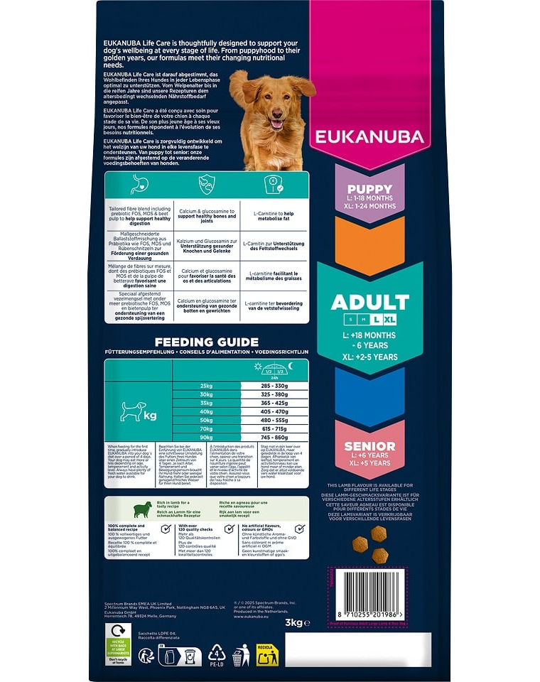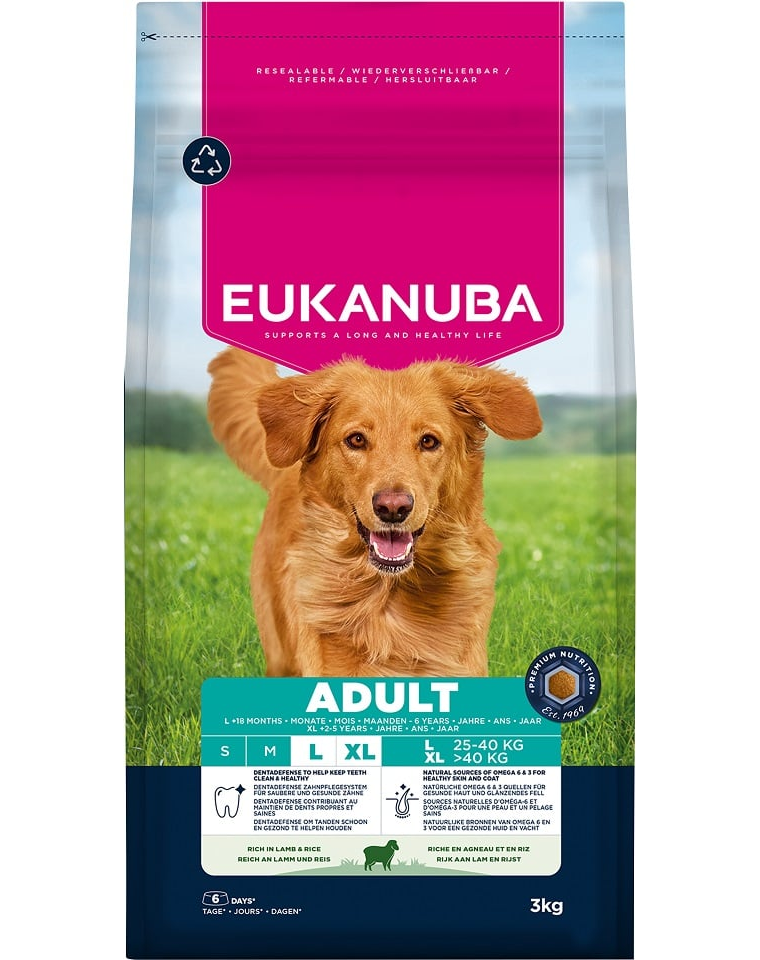 Eukanuba Adult Large Breeds Lamb & Rice este o hrană completă, premium, destinată câinilor de rase mari (18 luni – 6 ani) și rase gigantice (2–5 ani). Rețeta bogată în miel și orez este ușor de digerat și potrivită chiar și pentru câinii cu stomac sensibil.
