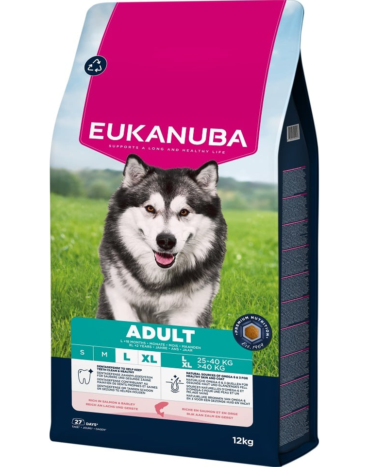 Hrana uscată EUKANUBA Adult Large Breeds Salmon & Barley face parte din linia premium EUKANUBA Life Care, creată pe baza cercetărilor științifice pentru a sprijini sănătatea câinilor adulți de rase mari (de la 18 luni) și a celor de rase gigantice (de la 2 ani). Formula completă și echilibrată oferă nutriție avansată, energie și o digestie ușoară – esențiale pentru vitalitatea și forma fizică optimă a câinelui.