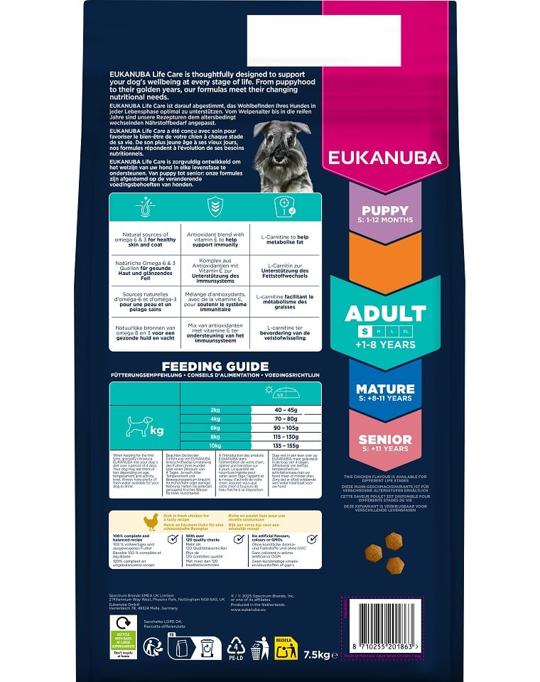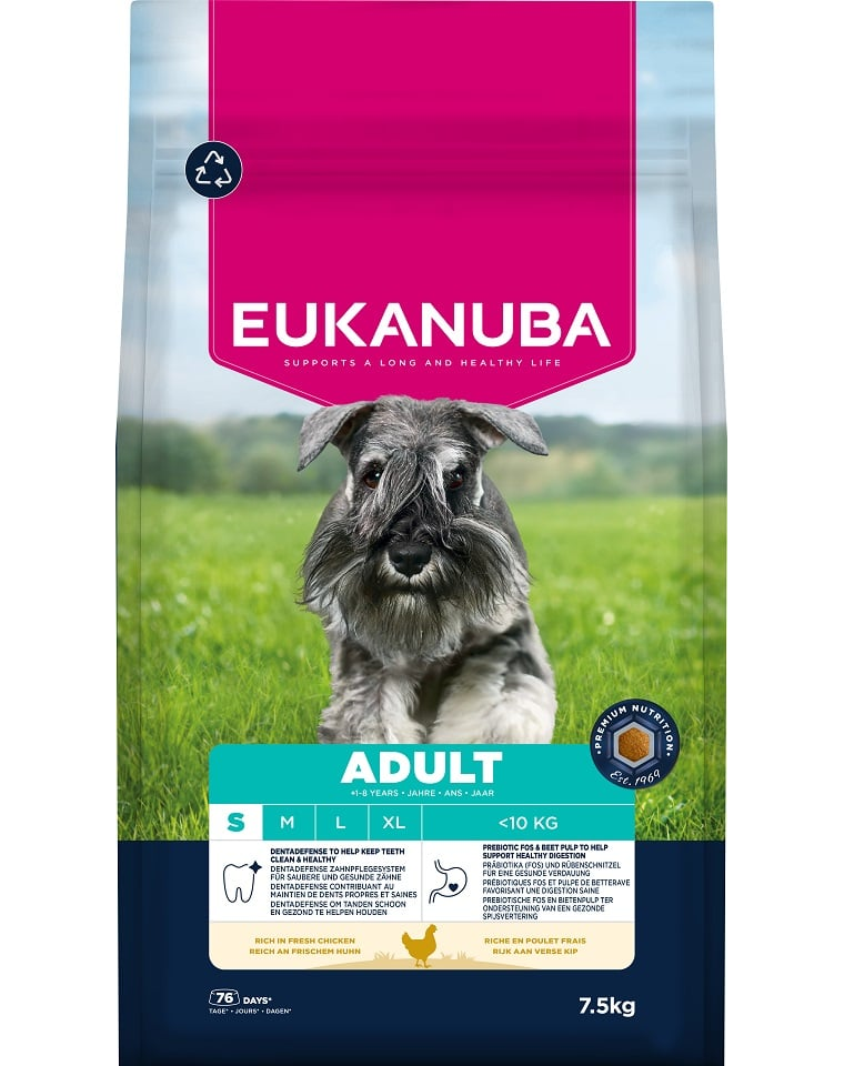 Hrana uscată EUKANUBA Adult Small Breeds Chicken este o formulă completă și echilibrată, creată special pentru câinii adulți de rase mici (1–8 ani). Rețeta premium, dezvoltată pe baza cercetărilor științifice, oferă nutriția de care câinele tău are nevoie zilnic pentru sănătate, energie și vitalitate.
