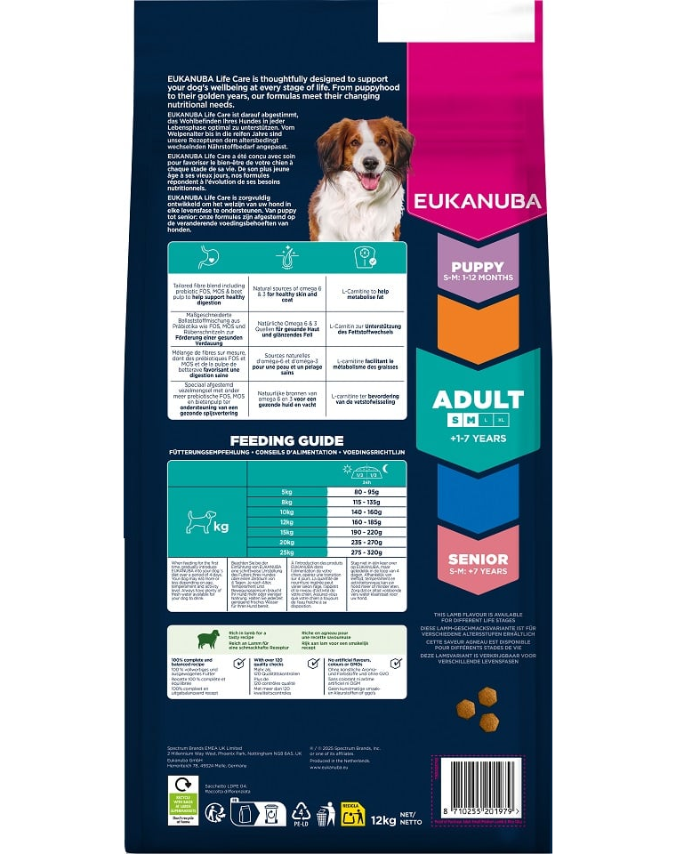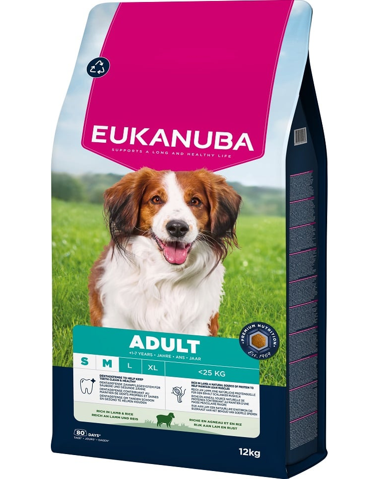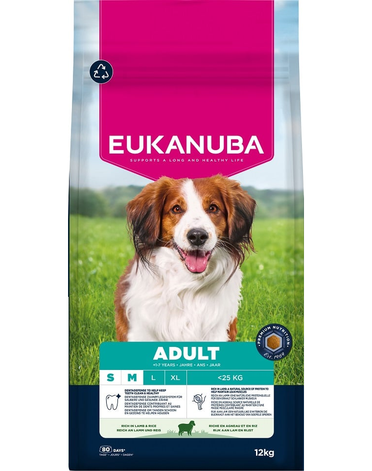 EUKANUBA Adult Small Medium Breeds Lamb Rice 12 kg hrană câini rase mici și medii bogată în carne de miel și orez