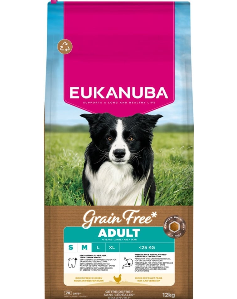 EUKANUBA Grain Free Adult Small & Medium Chicken este o hrană completă, uscată, fără cereale, destinată câinilor adulți de talie mică și medie, cu vârsta de peste 1 an. Rețeta a fost concepută pentru a menține o condiție fizică optimă, un digestie sănătoasă și bună dispoziție zilnică, în special pentru câinii sensibili la cereale.