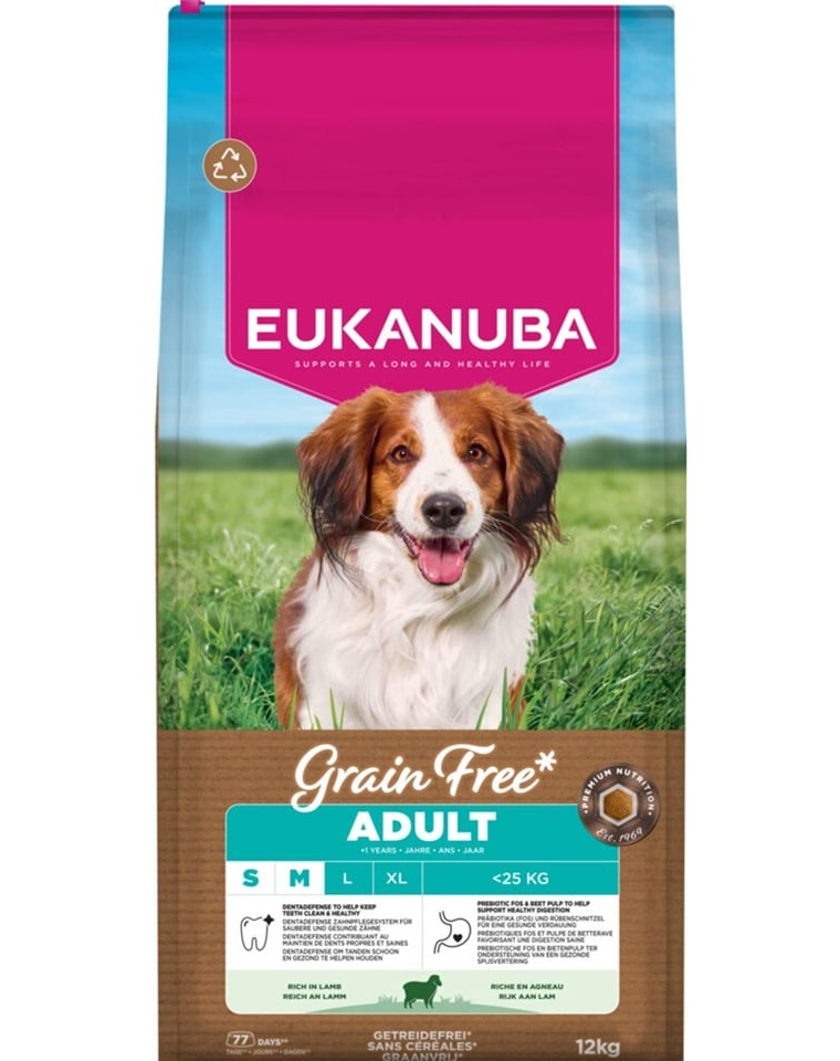 EUKANUBA Grain Free Adult Small & Medium Lamb este o hrană completă, uscată, fără cereale, destinată câinilor adulți de talie mică și medie, cu vârsta peste 1 an. Formula cu conținut redus de alergeni a fost creată pentru câinii cu sistem digestiv sensibil și cu predispoziție la intoleranțe alimentare, susținând starea lor generală și bunăstarea zilnică.