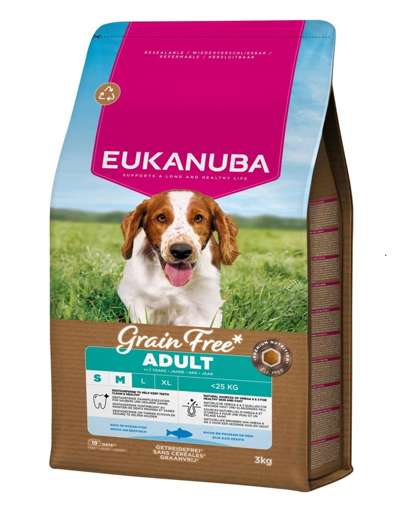 EUKANUBA Grain Free Adult Small Medium Ocean Fish 3 kg hrană câini adulți rase mici și medii, cu pește