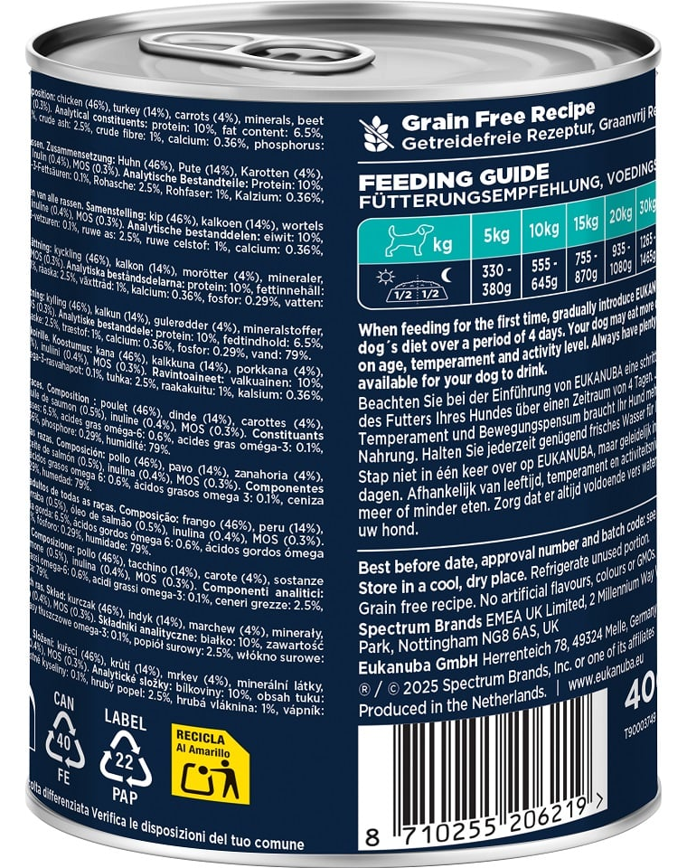Produsul are textura unui pate gros, cu bucăți vizibile de carne și legume, ceea ce îl face deosebit de apetisant pentru câini. Nu conține coloranți artificiali, arome artificiale sau conservanți. Poate fi oferit ca masă completă sau în combinație cu hrana uscată EUKANUBA pentru un aport nutritiv optim.