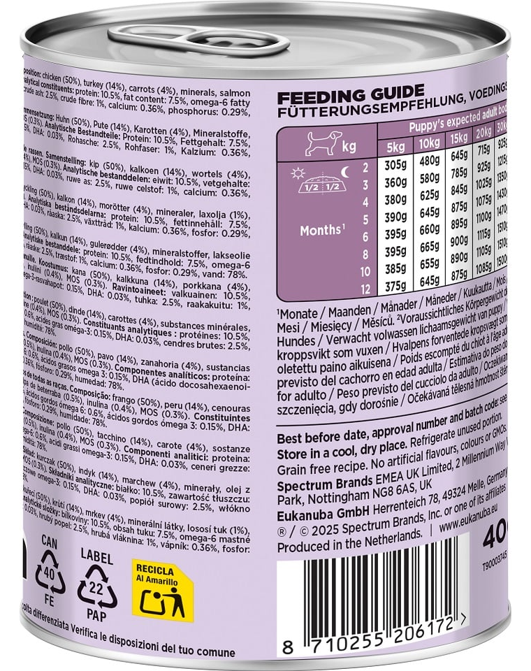 Rețeta are la bază carne de pui, îmbogățită cu curcan – surse de proteine de înaltă calitate, care susțin dezvoltarea optimă a musculaturii. Adaosul de morcov furnizează vitamine naturale și fibre, diversificând alimentația. Uleiul de somon este o sursă de acizi grași Omega-3, care sprijină dezvoltarea creierului, a vederii, precum și sănătatea pielii și a blănii. Pulpa de sfeclă, inulina și prebioticele MOS contribuie la o digestie sănătoasă, iar nivelul adecvat de calciu susține oase și articulații puternice.