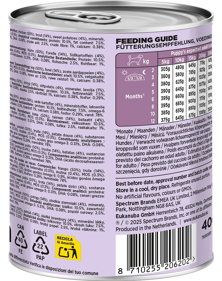 EUKANUBA Puppy este o hrană umedă completă și echilibrată, creată special pentru cățeii tuturor raselor, cu vârsta între 1 și 12 luni. Asigură toți nutrienții esențiali necesari pentru o creștere armonioasă, dezvoltarea corectă a musculaturii și menținerea stării generale de bine.