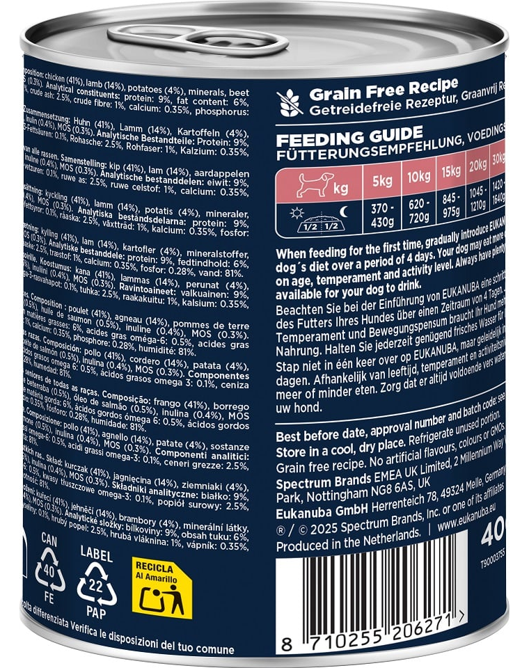 Compoziție: Curcan 41%, miel 14%, cartofi 4%, minerale, pulpă de sfeclă 0,5%, ulei de somon 0,5%, inulină 0,4%, prebiotice MOS 0,3%.