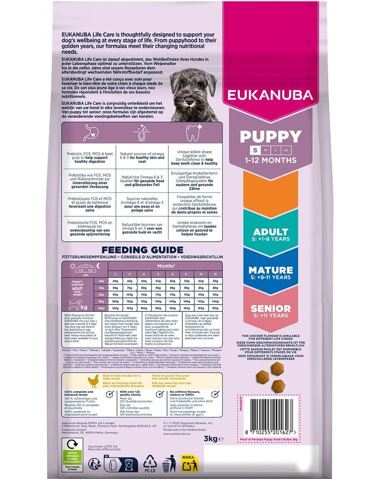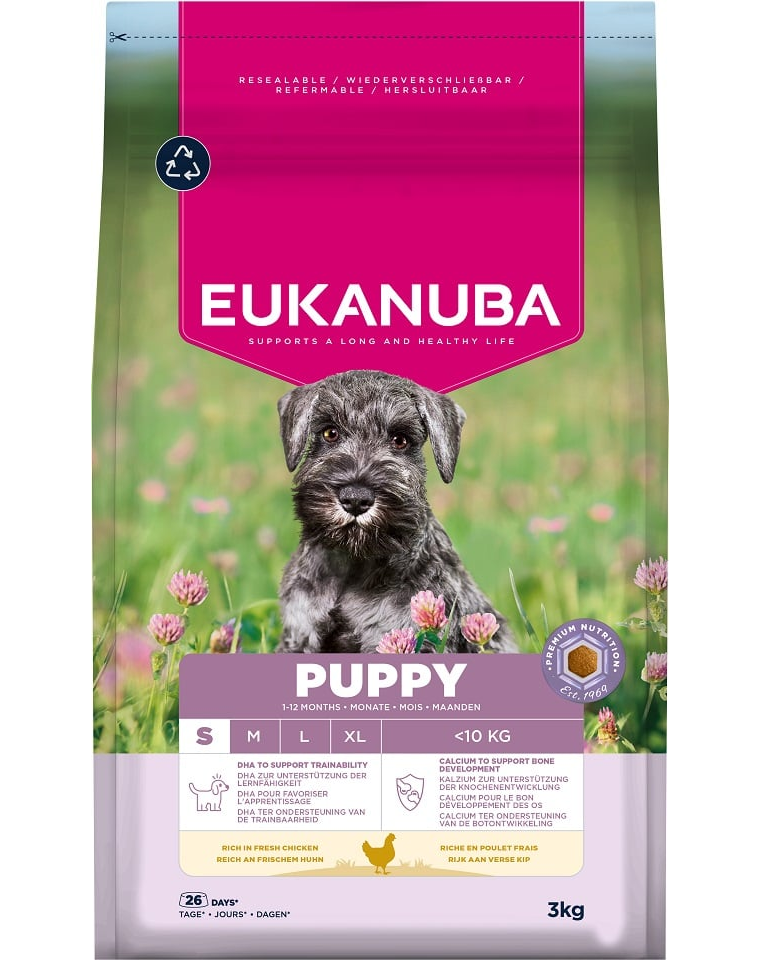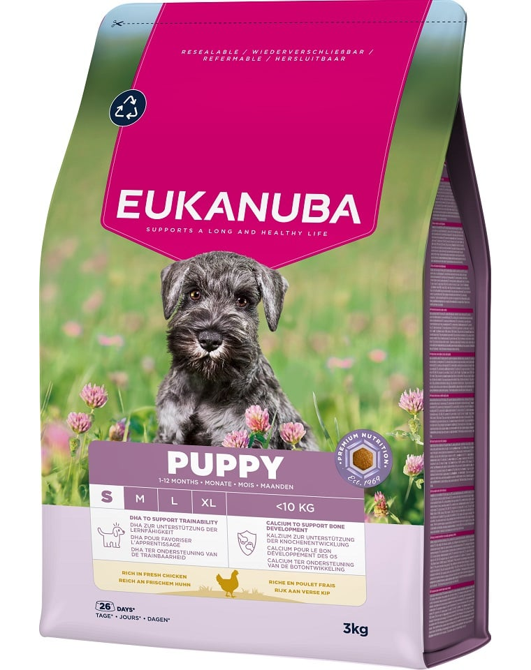 Hrana uscată EUKANUBA Puppy Small Breeds Chicken este o formulă premium completă și echilibrată, creată special pentru căței de rase mici cu vârsta între 1 și 12 luni. Conține carne proaspătă de pui – o sursă valoroasă de proteine ușor digerabile, care sprijină creșterea armonioasă, dezvoltarea musculară și nivelul optim de energie al puilor activi.