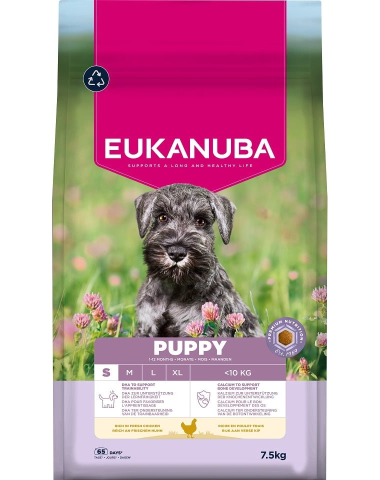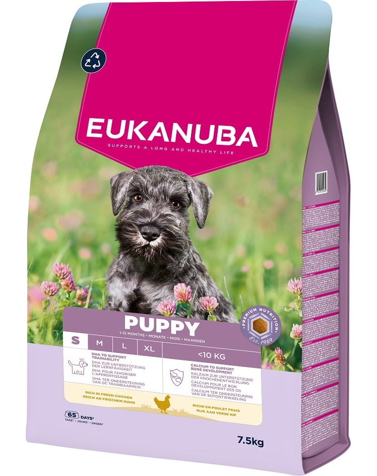 Hrana uscată EUKANUBA Puppy Small Breeds Chicken este o formulă premium completă și echilibrată, creată special pentru căței de rase mici cu vârsta între 1 și 12 luni. Conține carne proaspătă de pui – o sursă valoroasă de proteine ușor digerabile, care sprijină creșterea armonioasă, dezvoltarea musculară și nivelul optim de energie al puilor activi.