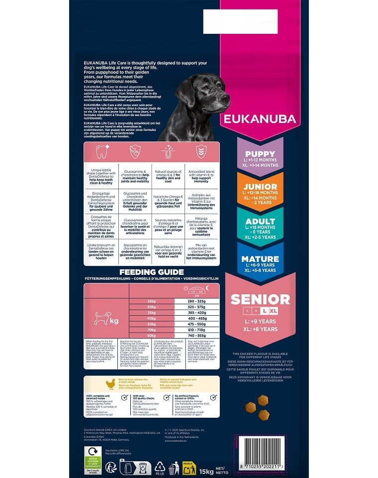 Hrana uscată EUKANUBA Senior Large Breeds Chicken a fost creată special pentru câinii de rase mari cu vârsta peste 9 ani și pentru rasele gigantice peste 8 ani. Este o formulă completă, echilibrată și premium, concepută pentru a sprijini vitalitatea, mobilitatea și sănătatea generală a câinilor seniori.