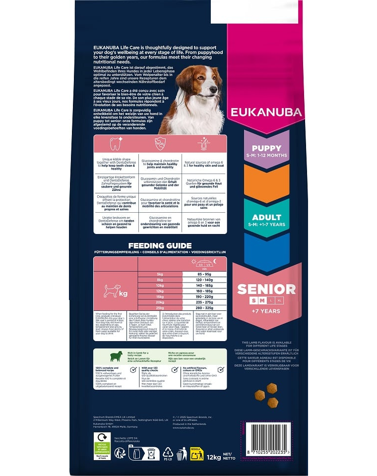 EUKANUBA Life Care este o hrană premium bazată pe cercetări științifice, concepută pentru a răspunde nevoilor nutriționale ale câinilor în toate etapele vieții. Această formulă este dedicată câinilor seniori de rase mici și medii (peste 7 ani), oferind o combinație ușor digestibilă de orez și miel de înaltă calitate – ideală și pentru câinii cu sensibilități digestive.