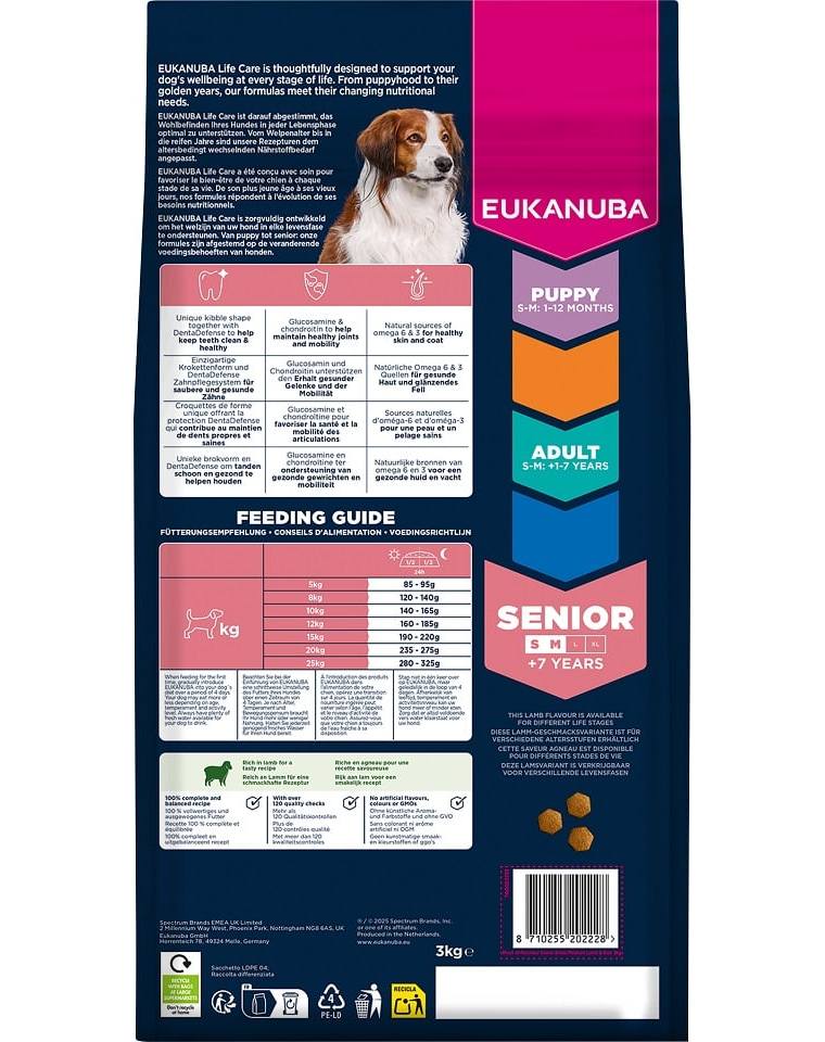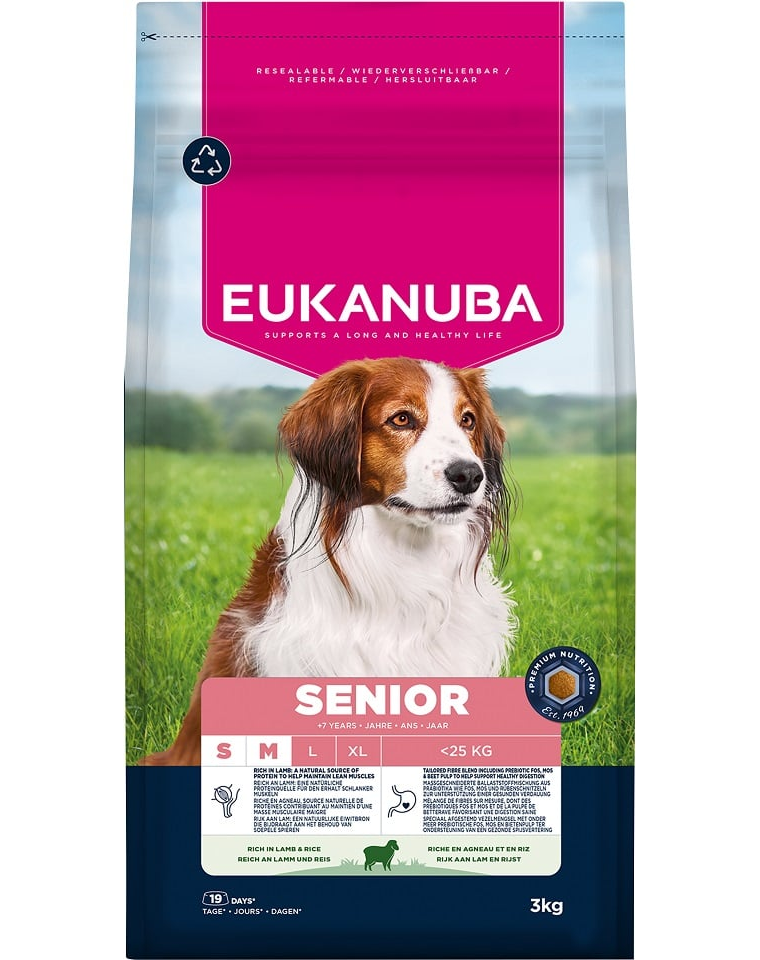 Hrana uscată EUKANUBA Senior Small & Medium Breeds Lamb & Rice este o formulă completă și echilibrată, ideală pentru câinii seniori de rase mici și medii cu vârsta peste 7 ani.
