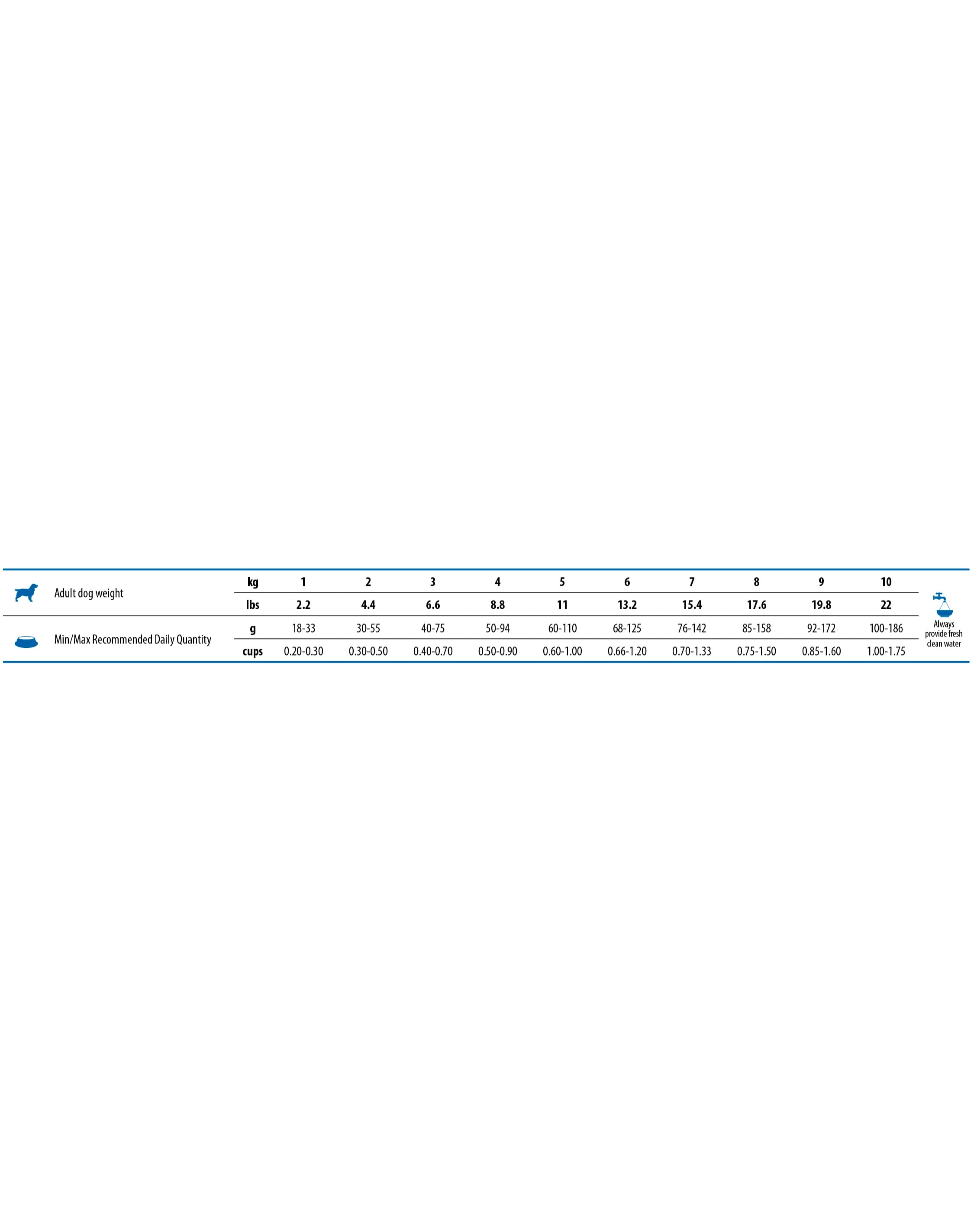 Proteină brută 34,00%; Grăsime brută 18,00%; Fibre brute 3,30%; Umiditate 9,00%; Cenușă brută 8,60%; Calciu 1,10%; Fosfor 0,80%; Omega-6 3,30%; Omega-3 0,90%; DHA 0,50%; EPA 0,30%; Glucozamină 1200mg/kg; Sulfat de condroitină 900mg/kg.