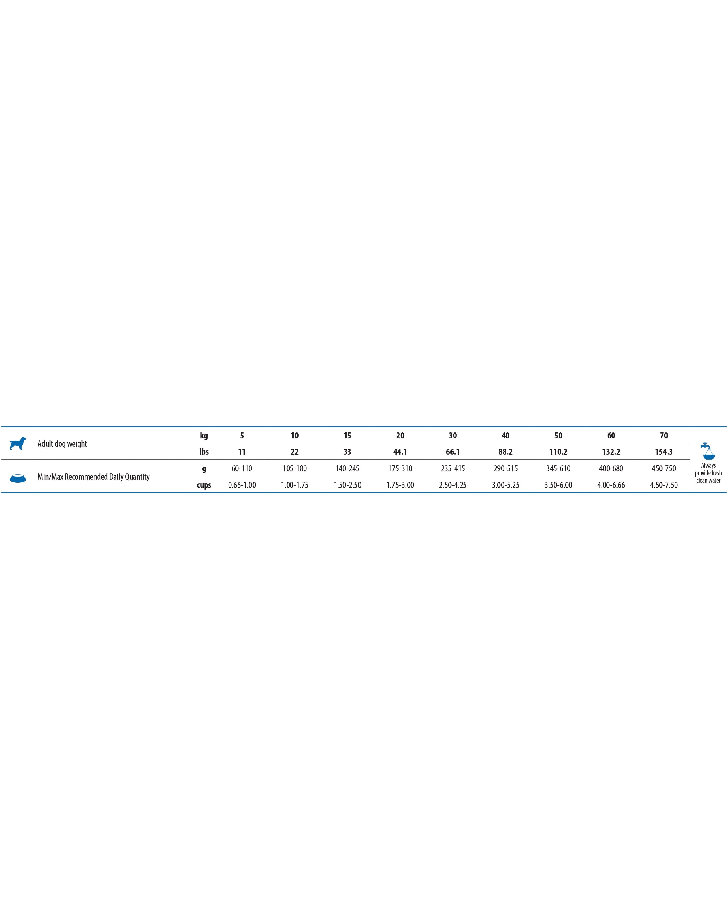 Proteină brută 23,00%; grăsime brută 12,00%; fibre brute 2,80%; conținut de umiditate 9,00%; cenușă brută 7,90%; calciu 1,10%; fosfor 0,90%; acizi grași Omega-3 0,40%; acizi grași Omega-6 2,20%; DHA 0,20%; EPA 0,10%; glucozamină 1200mg/kg; sulfat de condroitină 900mg/kg.