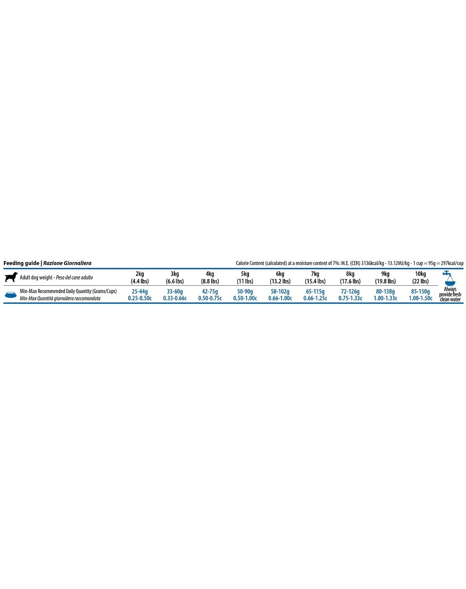 proteină brută 28,00%; grăsime brută 8,00%; fibre brute 8,20%; umiditate 9,00%; cenușă brută 7,90%; Calciu 0,90%; Fosfor 0,80%; Sodiu 0,30%; Potasiu 0,65%; Magneziu 0,12%; Acizi grași omega-6 1,20%; Acizi grași omega-3 0,25%; DHA 0,12%; EPA 0,10%; Glucozamină 1200 mg / kg; Sulfat de condroitină 900mg / kg.