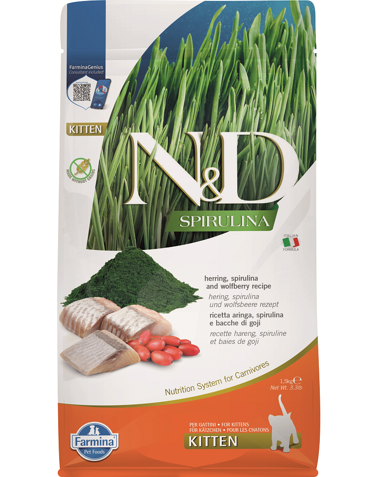 N&D Spirulina este o linie de hrană premium care utilizează puterea superalimentelor naturale și a ingredientelor de înaltă calitate de origine animală. Creată fără cereale, conservanți artificiali și aditivi inutili – susține sănătatea celor mai tineri pisoi și a mamelor lor încă din prima zi.