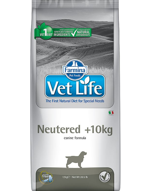 Dietă completă concepută pentru menținerea sănătății câinilor adulți sterilizați cu o greutatea corporală de peste 10 kg.