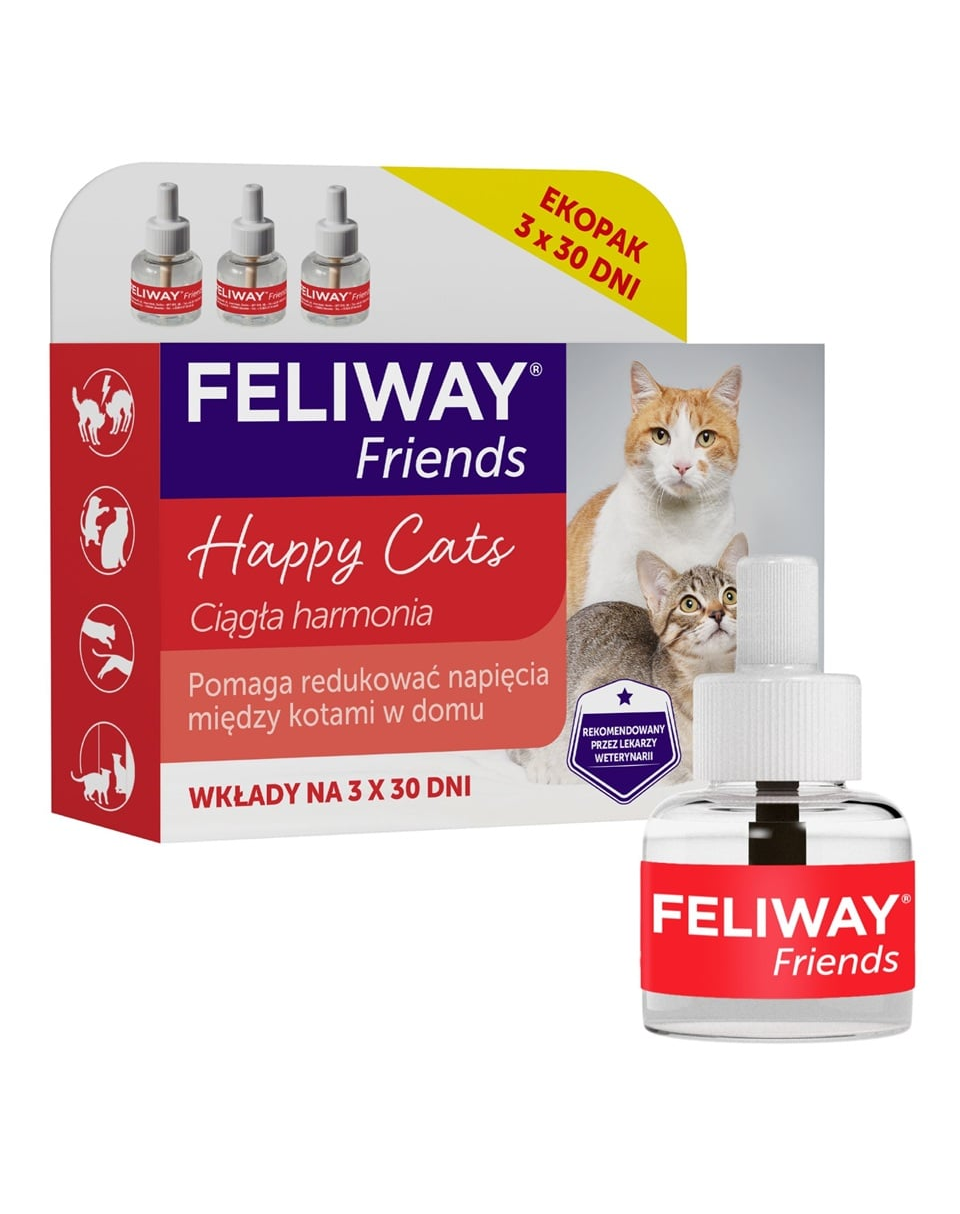 Feliway Friends este o soluție pe bază de feromoni destinată pisicilor care locuiesc împreună și manifestă tensiuni, conflicte sau dificultăți în a se accepta reciproc. Produsul contribuie la crearea unei atmosfere calme în locuință, reducând comportamente precum fugărirea, blocarea accesului, privirile fixe sau luptele între pisici.