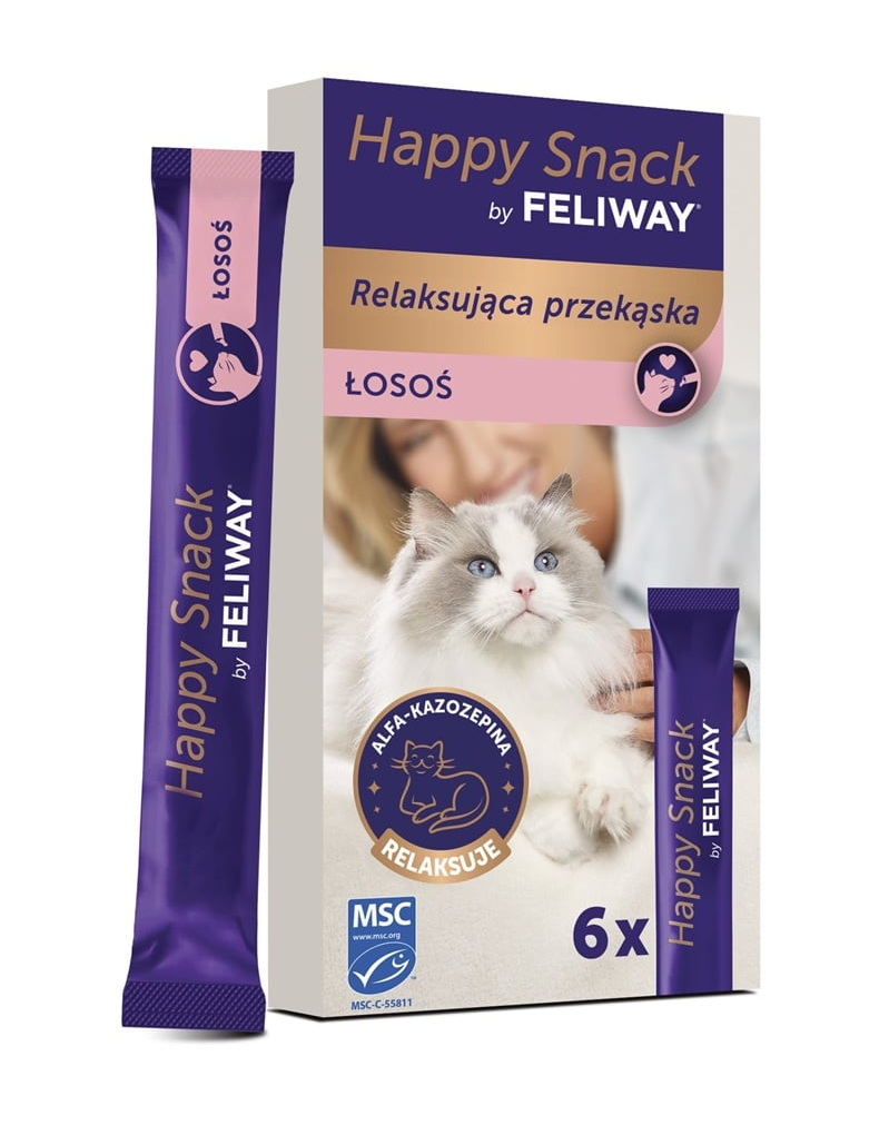 Formula conține somon certificat MSC și alfa-cazozepină – o proteină naturală din lapte cunoscută pentru efectele sale calmante. Datorită acestor ingrediente, gustarea poate sprijini pisica în momentele de stres, precum călătoriile, vizitele la veterinar sau schimbările din mediul în care trăiește. Este o opțiune sigură pentru utilizare zilnică, deoarece nu conține conservanți, coloranți, zahăr sau gluten.