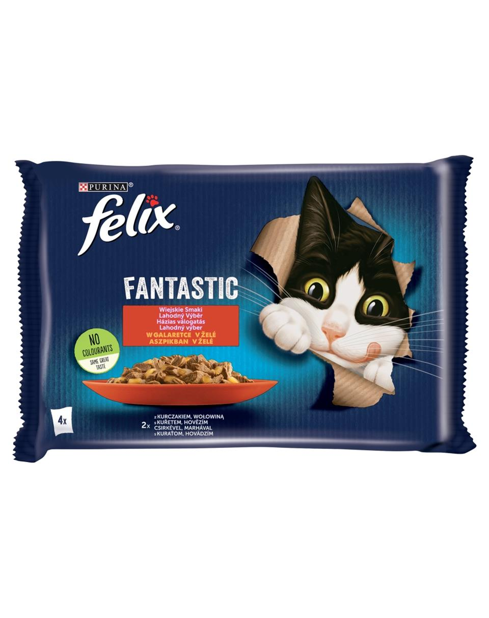 Hrană completă cu diferite tipuri de carne în jeleu pentru pisici adulte.