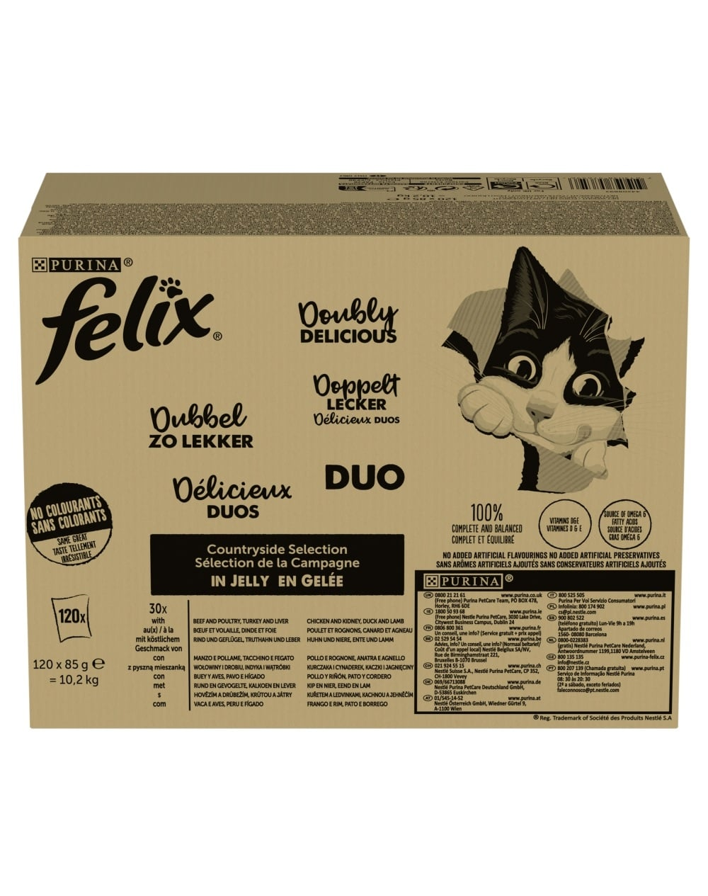 Felix Fantastic DUO este o hrană umedă completă pentru pisici adulte, disponibilă într-un multipack extins, potrivit pentru hrănirea zilnică pe termen lung.