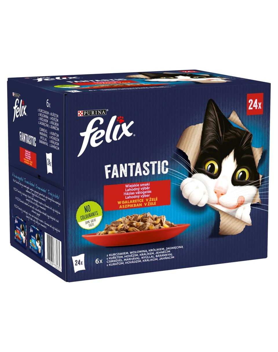 Hrană completă cu diverse tipuri de carne în jeleu pentru pisici adulte.